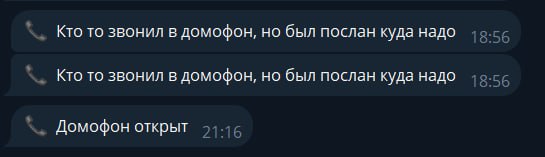 Сейчас у меня в дашборде есть кнопки для переключения режимов домофона, автоматически открывать, или автоматически сбрасывать. И кнопка отключения трубки. При открытие или сбросе мне приходят соответствующие сообщения в телегу и пылесос говорит, что дверь открыта